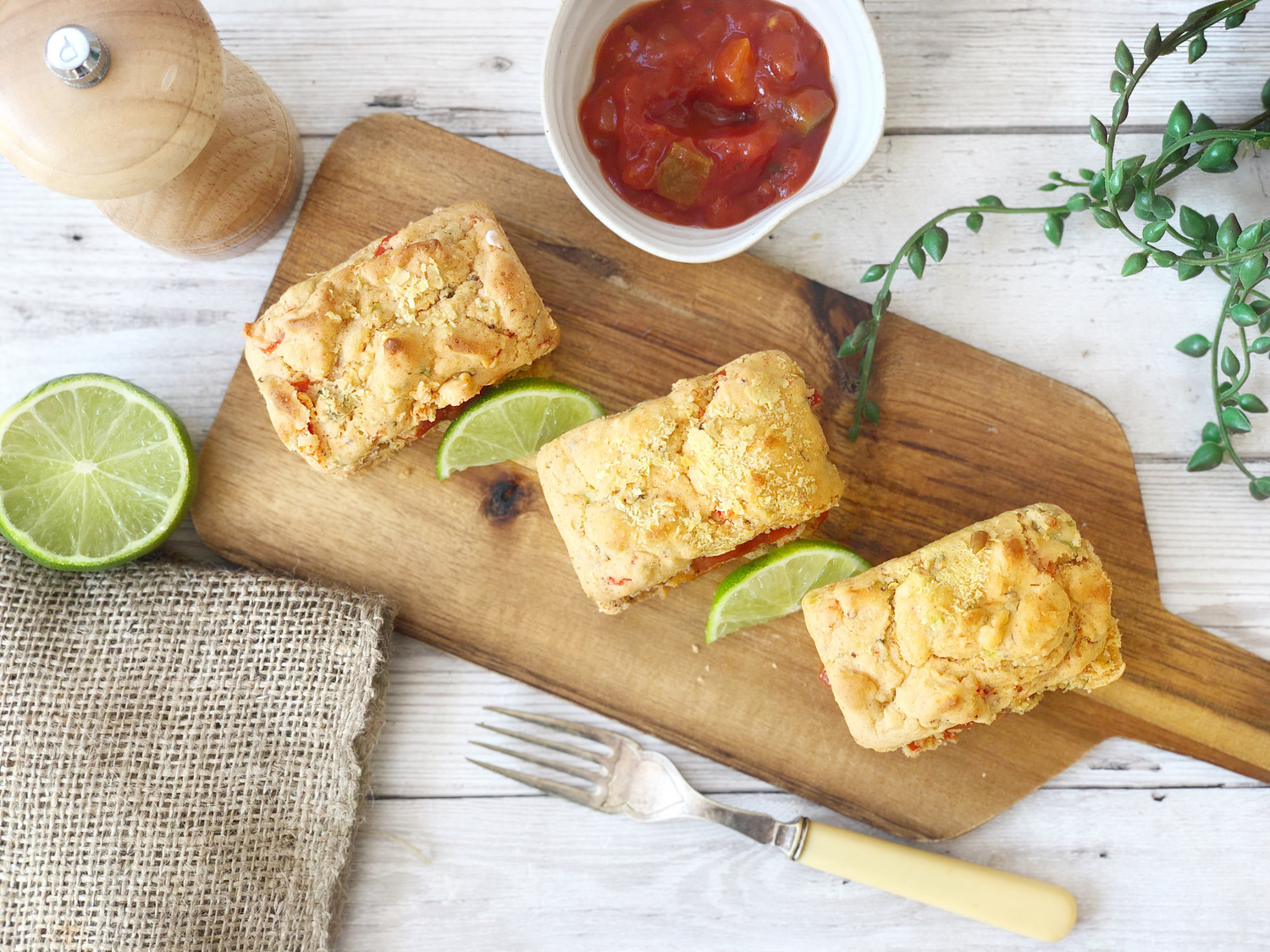 Cool and slice. Sandwich together with the salsa and extra squeeze of lime.